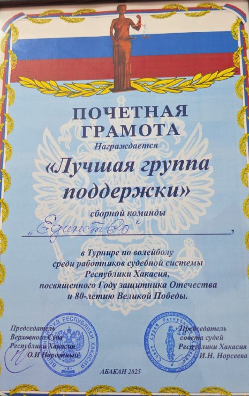 Судьи и работники суда приняли участие в турнире по волейболу, посвященному Году защитника Отечества и 80-летию Великой Победы. Всего в турнире участвовали семь команд. Почетное 4 место заняла сборная команда «Единство» - Абаканский городской суд и мировые судьи города Абакана. Группа поддержки сборной команды «Единство» была отмечена организаторами проведения мероприятия почетной грамотой.